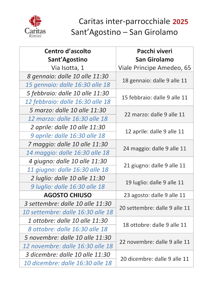 – un centro di ascolto per accogliere situazioni di fragilità economica e anche fisica : 1 volta al mese a S Agostino;
