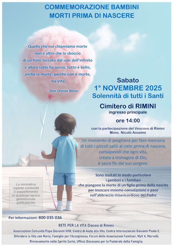 Commemorazione bambini morti prima di nascere Data 01 Nov 2025 Ora 14:00 - 15:00 Ora locale Fuso orario: America/New_York Data: 01 Nov 2025 Ora: 9:00 - 10:00 Luogo Ingresso Cimitero Rimini Categoria Eventi Condividi questo evento