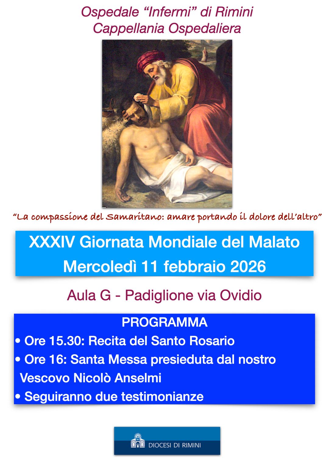 Giornata del Malato Data 11 Feb 2026 Ora 15:30 - 18:00 Ora locale Fuso orario: America/New_York Data: 11 Feb 2026 Ora: 9:30 - 12:00 Luogo Cappella Ospedale Infermi Rimini Categoria Eventi Condividi questo evento