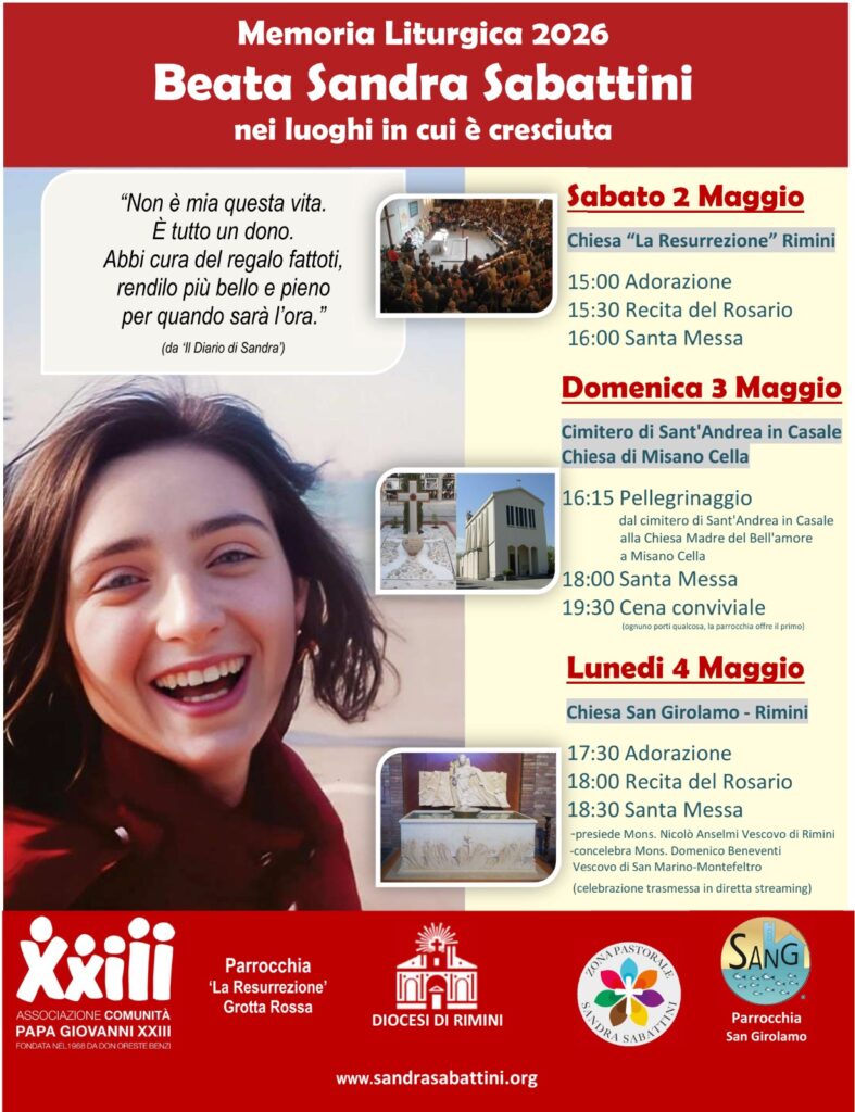 Memoria della beata Sandra Sabattini Data 02 - 05 Mag 2026 Ora 15:00 - 20:00 Ora locale Fuso orario: America/New_York Data: 02 - 05 Mag 2026 Ora: 9:00 - 14:00 Categoria Eventi Condividi questo evento